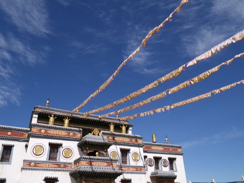 Visite du monastère d’Erdene Zuu. Erdene Zuu est le premier monastère de Mongolie à avoir été construit « en dur ». Sa première construction date de 1585 et 3 de ses 62 temples, ainsi que le mur d’enceinte et ses stupas, ont été épargnés lors de la purge communiste. Le monastère est aujourd’hui redevenu un lieu de culte actif, après des années de fonctionnement interdit.